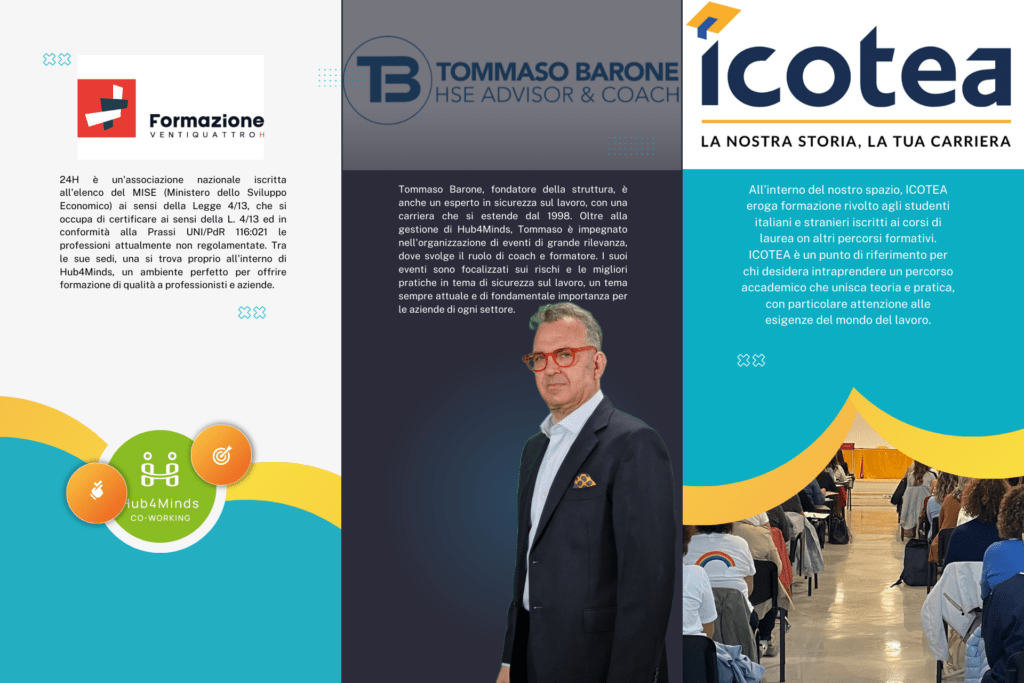 La collaborazione con Formazione 24H, Tommaso Barone e ICOTEA permette a Hub4Minds di offrire un ecosistema dinamico e completo, dove formazione, sicurezza sul lavoro e sviluppo professionale si fondono in un ambiente ideale per studenti, professionisti e aziende.